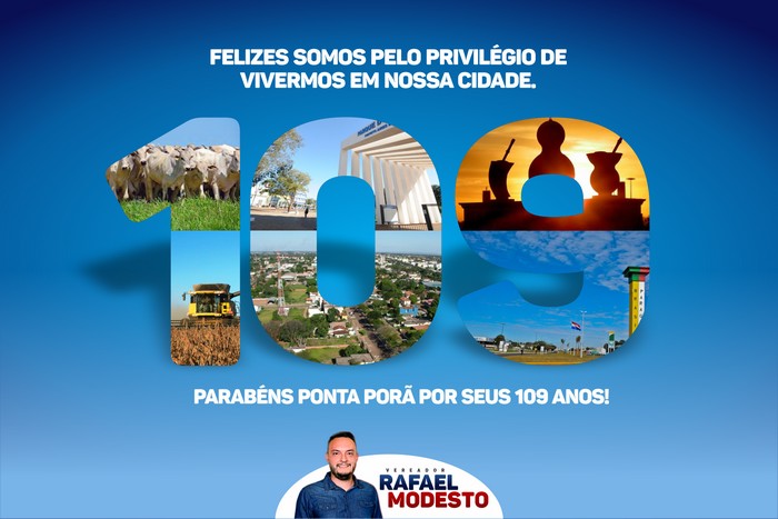 Rafael Modesto, em nome de todos os vereadores e vereadoras, parabeniza a “Princesinha dos Ervais”, pelos 109 anos de História. São décadas de crescimento, desenvolvimento, frutos de trabalho de diversas gerações. “Que nossa Ponta Porã continue trilhando o caminho do desenvolvimento, gerando oportunidades a todos, qualidade de vida para a população”.