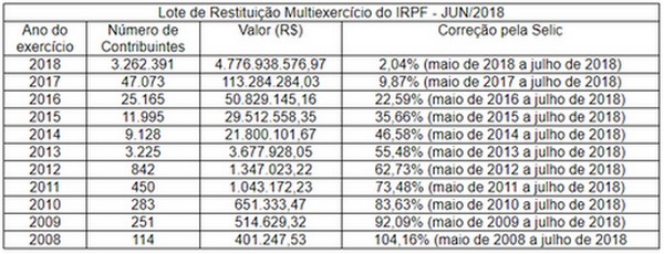 Os montantes de restituição para cada exercício, e a respectiva taxa Selic aplicada, podem ser acompanhados na tabela a seguir: