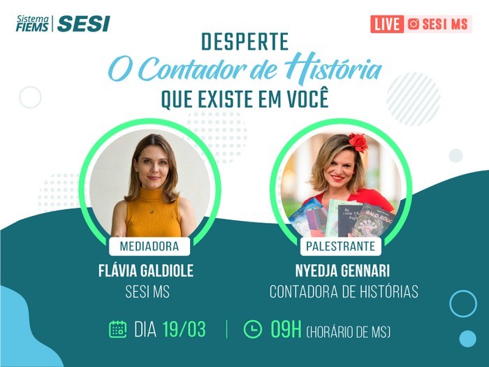 A live será realizada pelo Instagram do Sesi MS e terá um bate papo com a convidada especial Nyedja Gennari, professora e também escritora, formada em Ciências da Educação, com especialização em Literatura Infantil e pós-graduação em Educação Infantil. Com mais de 25 anos de experiência em sala de aula, Nyedja também construiu carreira como contadora de histórias e já se apresentou em feiras nacionais e internacionais.