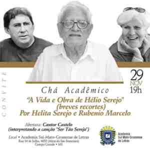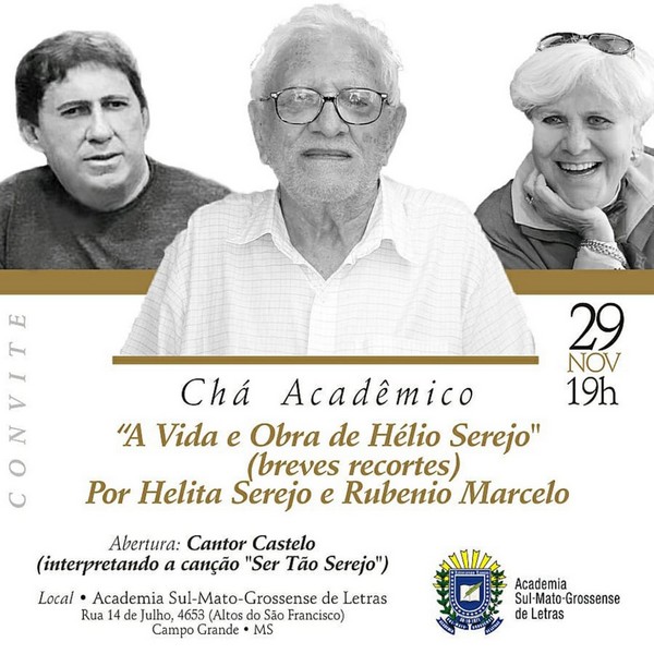 Acontecerá na quinta 29, a partir das 19h, na sede da Academia Sul-mato-grossense de Letras, o evento mensal ‘Chá Acadêmico da ASL’, que nesta edição apresentará uma concisa palestra de Rubenio Marcelo e Helita Serejo sobre a Vida e a Obra do saudoso escritor e folclorista Hélio Serejo, que também pertenceu à ASL.