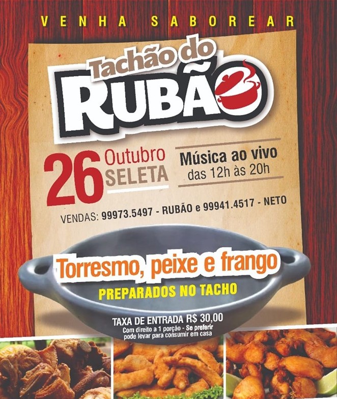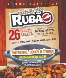 Desta feita o evento denominado de “Tachão do Rubão”, que será em prol do publicitário Rubens Moreira Júnior, estará ao preço de 30 reais por pessoas, e será servido torresmo, peixe e frango preparados no tacho e com direito a uma porção -bebidas à parte- assim como das 12h às 20h haverá apresentação de música ao vivo.