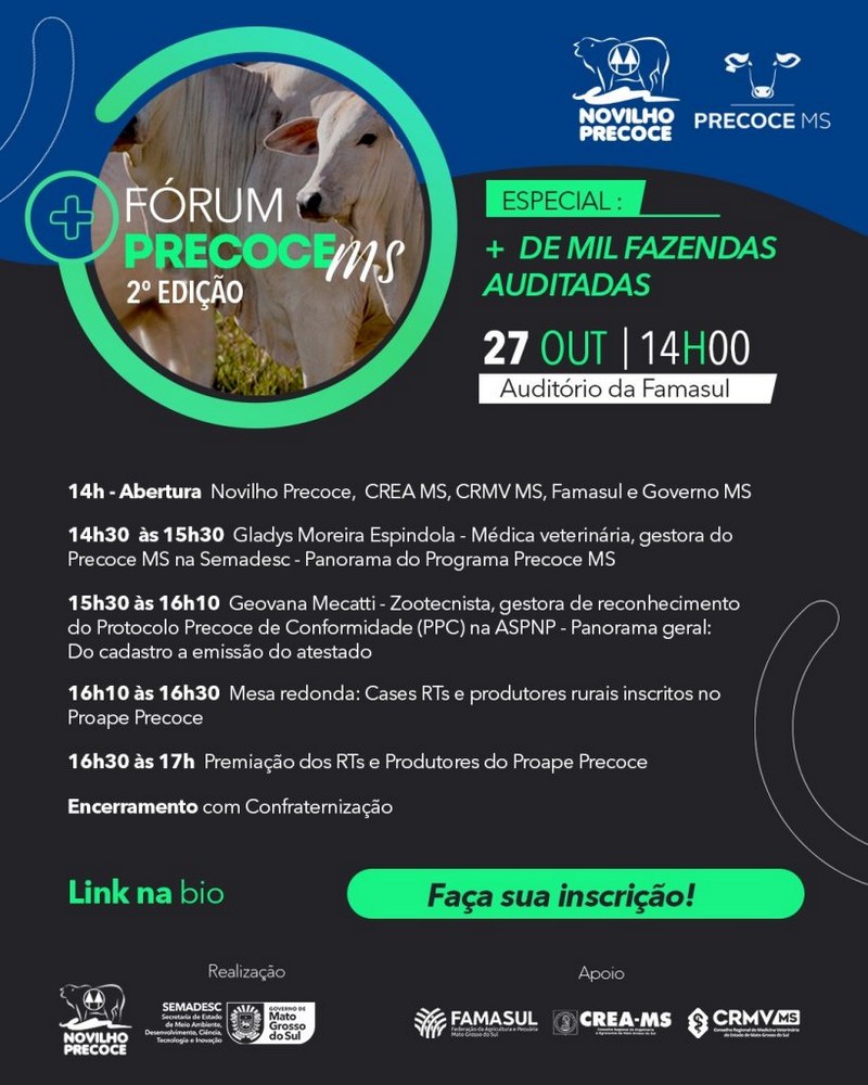 A Secretaria de Estado de Meio Ambiente, Desenvolvimento, Ciência, Tecnologia e Inovação (Semadesc) em parceria com a Associação Sul-Mato-Grossense dos Produtores de Novilho Precoce (ASPNP), realiza na segunda-feira (27), a 2ª edição do Fórum Técnico do Precoce MS, em Campo Grande. O evento, começa às 14 horas, no auditório da Famasul.