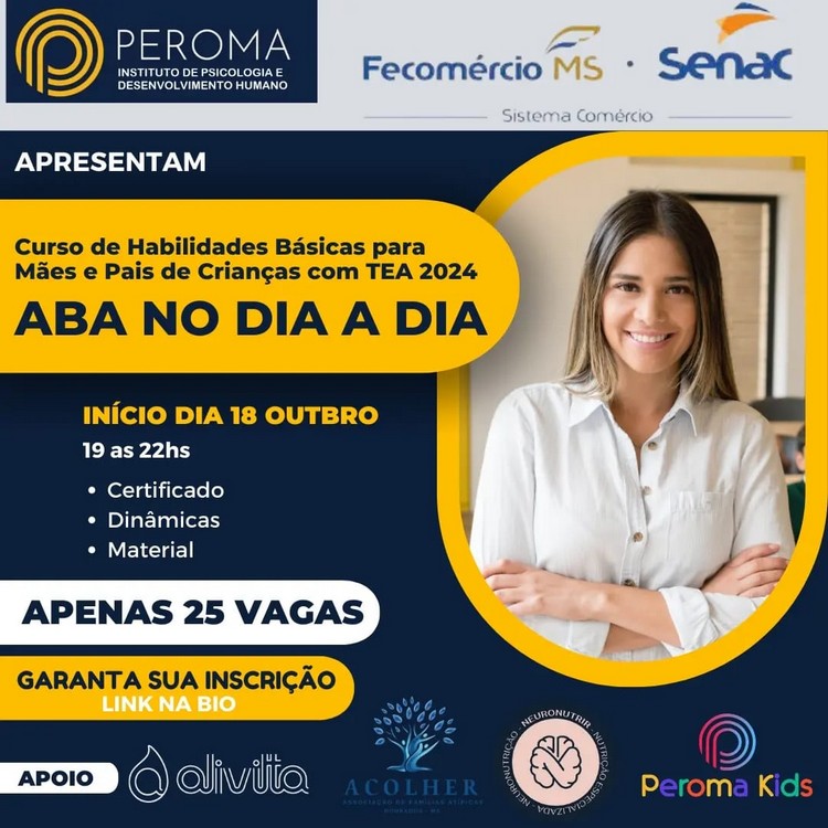 O Senac Dourados sedia entre os dias 18 de outubro a 8 de novembro, às sextas-feiras, das 19h às 22h, o curso de “Habilidades básicas para mães e pais de crianças com TEA – ABA no dia a dia”. Oportunidade para os pais receberem auxílio para aprender a aplicar métodos de habilidades para autistas, com o método ABA.
