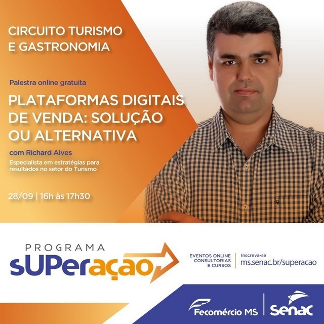 O Senac MS retoma na próxima semana as atividades do programa Superação, dessa vez voltado para o segmento do turismo e da gastronomia. No dia 28 de setembro, às 16h, será realizada a palestra de abertura “Plataformas digitais de venda: solução ou alternativa”, com Richard Alves, especialista em estratégias para resultados no setor do turismo. Ele vai abordar as vantagens e desvantagens de utilizar plataformas digitais para alavancar as vendas. A palestra será online e a participação é gratuita.