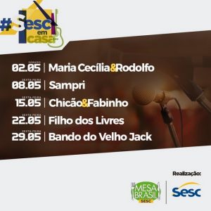 A partir de 02 de maio terá início o #SescEmCasa uma ação que congrega cultura e solidariedade, com shows de bandas já consagradas entre o público de Mato Grosso do Sul, que vão levar suas apresentações às casas das pessoas, por meio de LIVES e também chamar o público para praticar a solidariedade, doando alimentos para o Mesa Brasil Sesc.