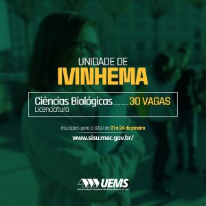 A Universidade Estadual de Mato Grosso do Sul (UEMS) abre 30 vagas para o curso de licenciatura em Ciências Biológicas da unidade de Ivinhema. O ingresso dos novos acadêmicos será realizado por meio do Sistema de Seleção Unificada (Sisu).