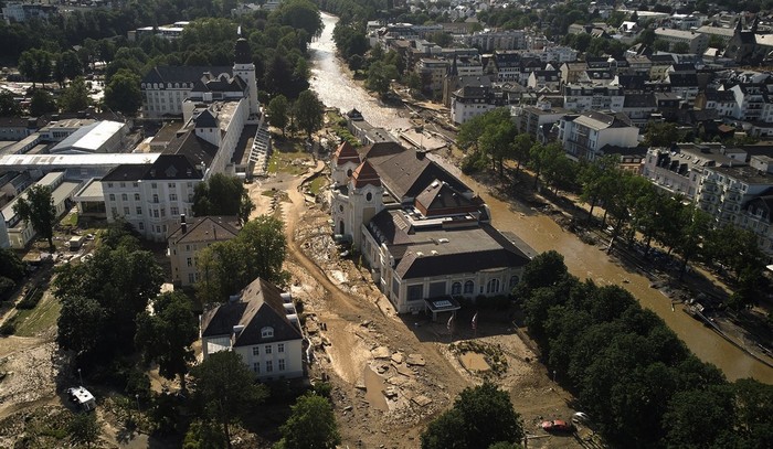 No domingo (19), a chanceler Angela Merkel visitou a cidade de Schuld, perto de Bonn, onde a cheia do rio Ahr destruiu parte do centro histórico.