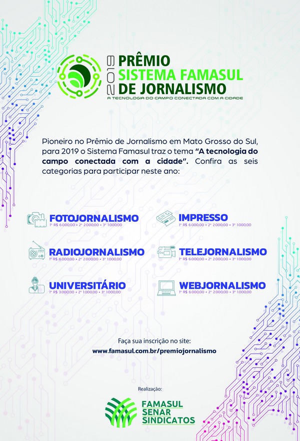 A tecnologia é uma ferramenta usada pelos produtores rurais e está presente no campo já há algum tempo. Por isso, o Prêmio Sistema Famasul de Jornalismo 2019 traz o tema “A tecnologia do campo conectada com a cidade” para que os jornalistas produzam conteúdos relacionados. Além do tema principal, existem frentes e assuntos correlacionados que também se encaixam para participação no concurso.