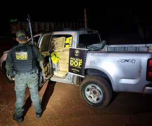 Alguns quilômetros à frente, próximo a uma mata, os policiais encontraram a S10 abandonada. Realizadas as buscas nas imediações, porém, nenhuma pessoa localizada. A placa afixada na camionete era falsa, além do registro criminal. No veículo estavam 600 quilos de maconha, 13,6 quilos de Skunk e 200 gramas de haxixe.