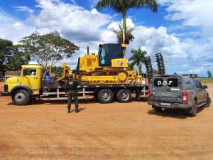 Policiais Militares do DOF (Departamento de Operações de Fronteira) recuperaram na tarde desta quinta-feira (15) uma máquina Caterpillar D-4 de cor amarela que havia sido roubada, no mesmo dia, no Paraná conforme registro de um Boletim de Ocorrência daquele Estado.