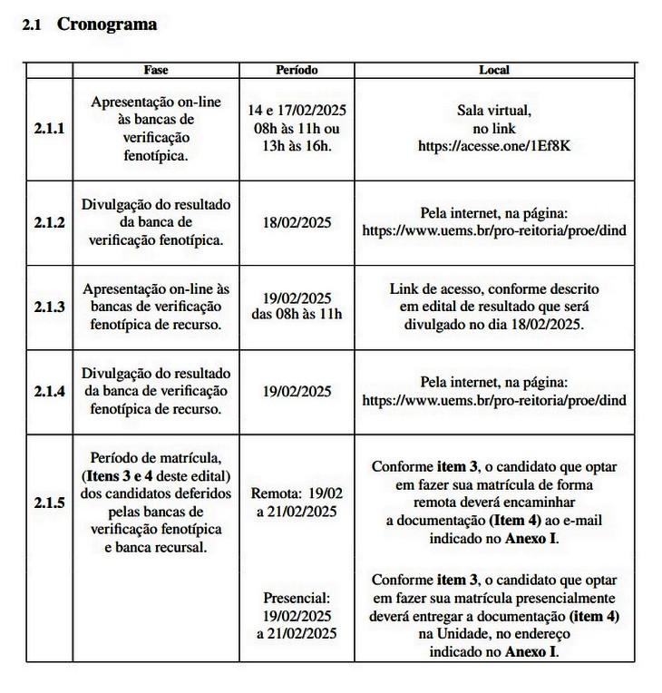 O Edital 006/2025 convoca para matrícula e participação em banca de verificação fenotípica os candidatos e candidatas classificados na 1ª Chamada da Lista de Espera no sistema de vagas reservadas para Negros (Pretos e Pardos). As bancas de verificação fenotípica ocorreram entre os dias 14 e 17 de fevereiro. A divulgação do resultado está prevista para o dia 18 de fevereiro e matrícula entre os dias 19 e 21 de fevereiro de 2025. Mais detalhes referentes ao cronograma devem ser conferidos diretamente no Edital 006/2025.
