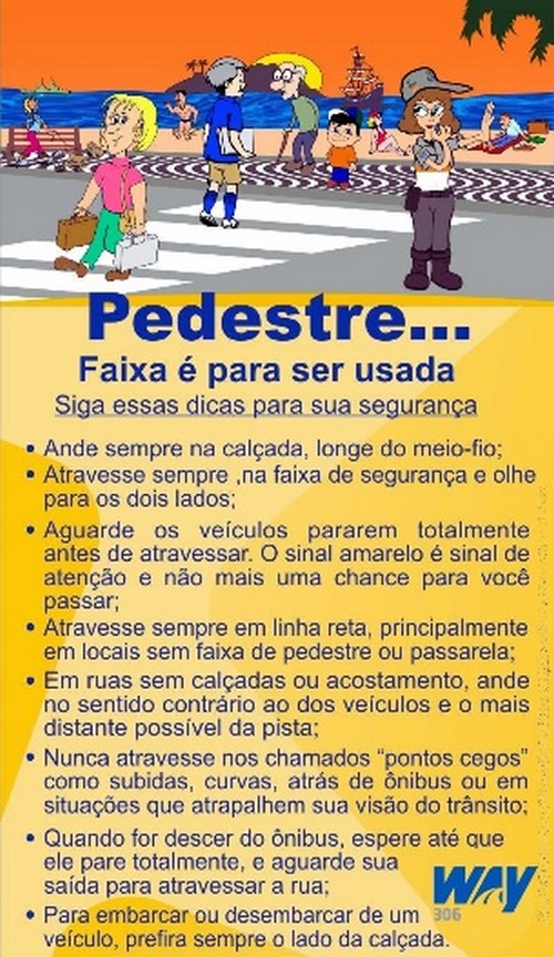 Para este mês de janeiro, o mote da campanha é “O Pedestre”, levando informações e dicas de segurança todos nós, que somos pedestres em algum momento do dia. E a Way-306 já está realizando a campanha para os colaboradores da empresa e para as cidades do trecho sob concessão, através de publicações em portais de notícias, jornais e spots nas rádios.