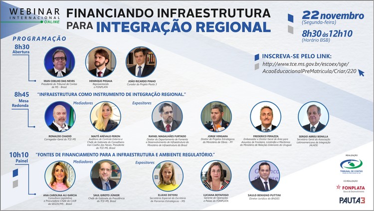 O Tribunal de Contas de Mato Grosso do Sul promove na próxima segunda-feira, 22 de novembro, em parceira com o Fundo Financeiro para o Desenvolvimento da Bacia do Prata (Fonplata) e o Projeto Pauta3, o webinar internacional “Financiando infraestrutura para integração regional”. O evento vai debater sobre o impacto dos financiamentos na infraestrutura e esclarecimento sobre oportunidades de financiamentos que contribuam efetivamente para a consolidação da sustentabilidade do progresso socioeconômico dos Estados e Municípios dos Países da Bacia do Prata.